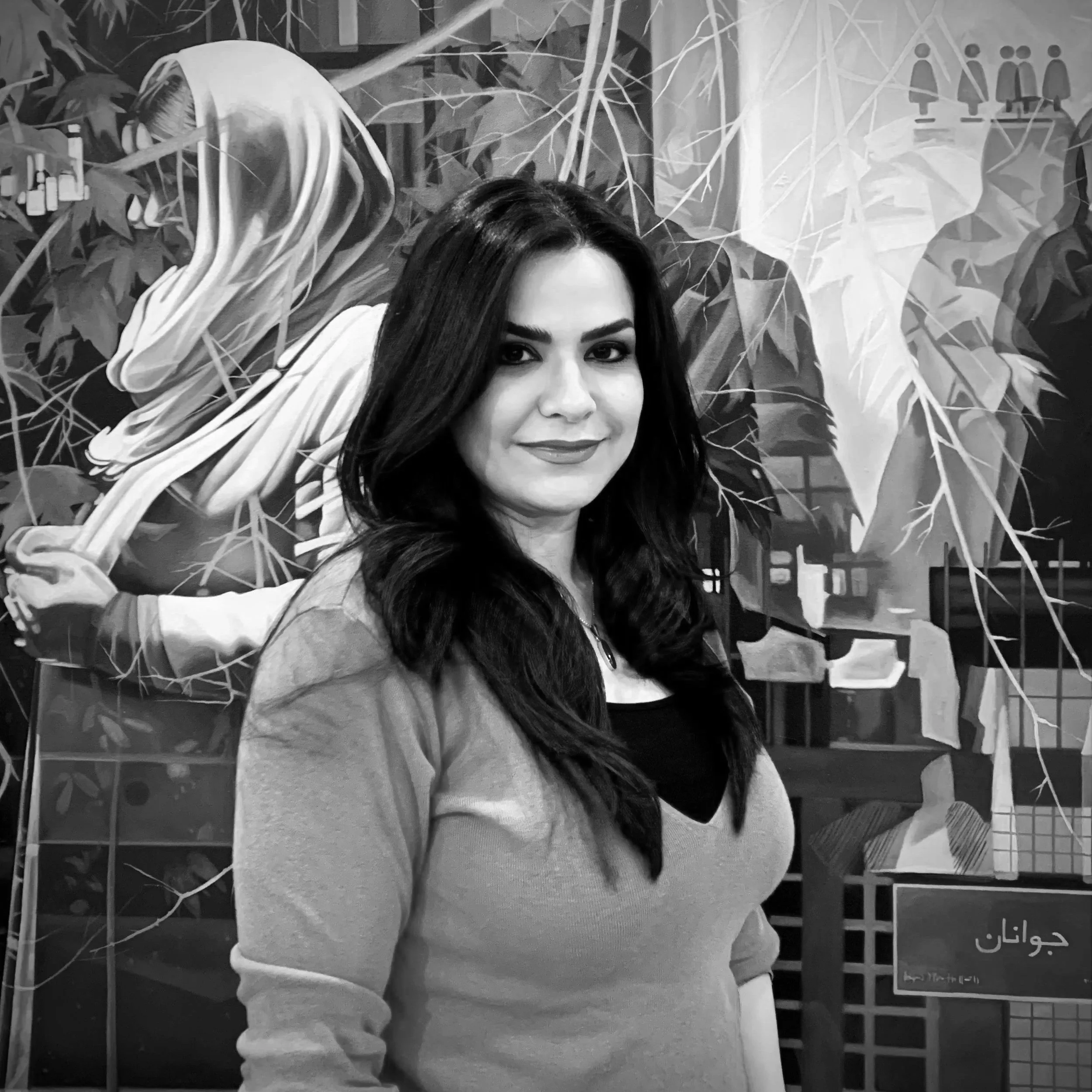 born in 1980 in Tehran, has participated in numerous group exhibitions. The artist made a name for herself with a solo show in 2013, titled Tehran No 12, where she portrayed the ambiance of fear and stress in a party when the Moral police shows up and she and her friends are hastily covering up and trying to escape. The audience could find the hidden figures behind purpose built structures using a flashlight. Her earlier works also show the environment of stress and insecurity that the young generations of Iranians have learned to live with.